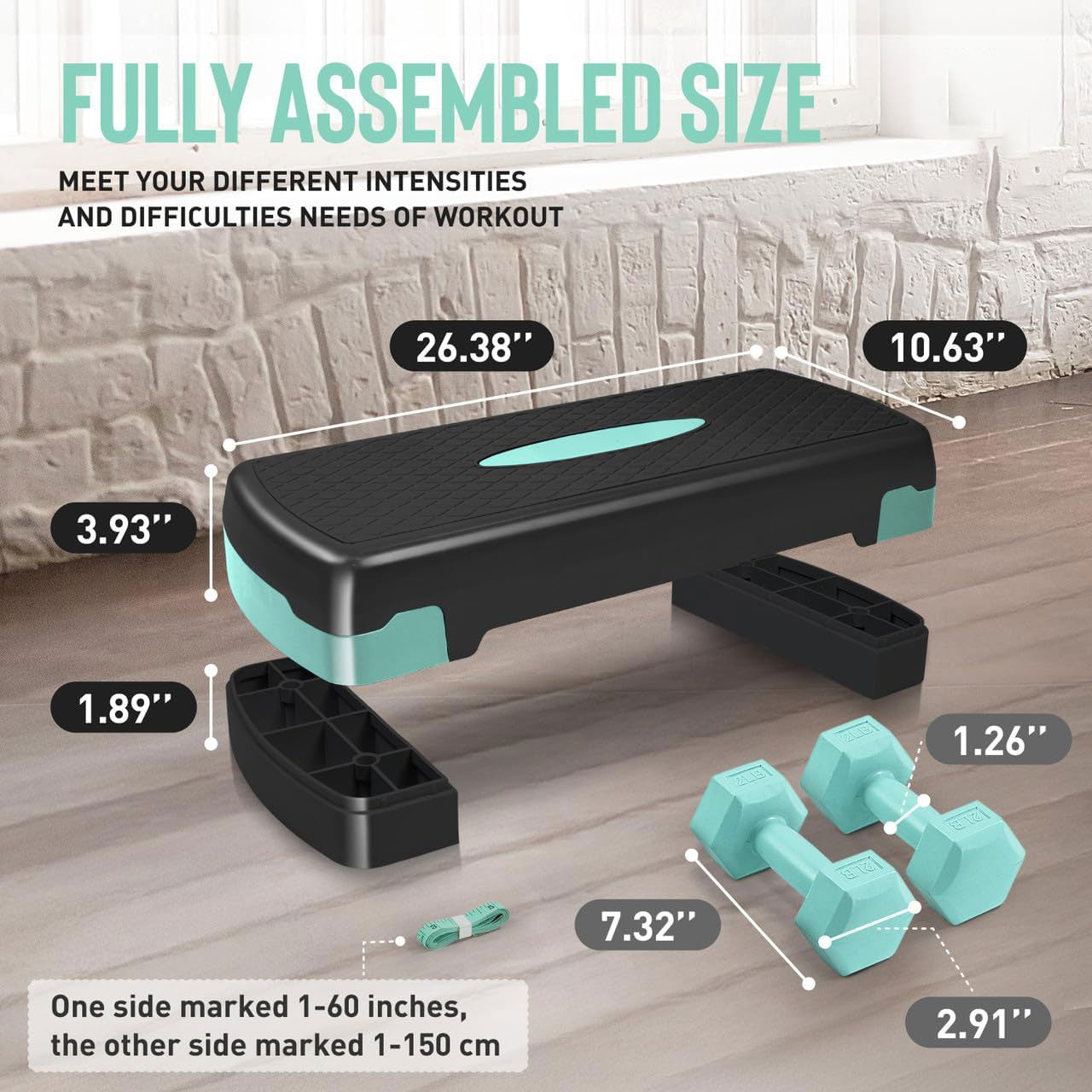Non-slip Designed All in One Set - The step platform features diamond groove patterns for a non-slip surface, providing better grip to prevent slipping; moreover, the four non-slip feet at the bottom ensure stability and protect your floor from scratches. This set includes one stepper, two 2 LB dumbbells and one measuring tape. Color available in blue, green and pink.
