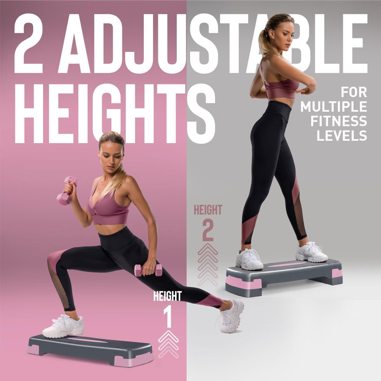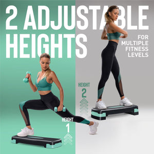 2 Adjustable Height Levels - With two risers, you can easily adjust the height of our exercise stepper between 4” and 6”; This feature helps strengthen training and burn more calories; it is available in three vibrant colors to match your style. Overall Size is 26.4”W x 10.6”D x 3.9”~5.8”H.