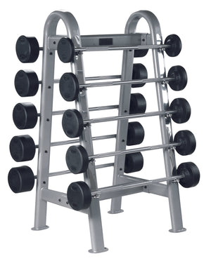 The YORK® ETS Fixed Straight and Curl Barbell rack is as attractive as it is functional. The curved tubing and sturdy legs provide a high level of stability and ease of use. This storage rack can hold 10 barbells and is double sided for easy loading and unloading. The rack can be utilized to store both Straight Pro Style Fixed Barbells as well as Curl Pro Style Fixed Barbells.