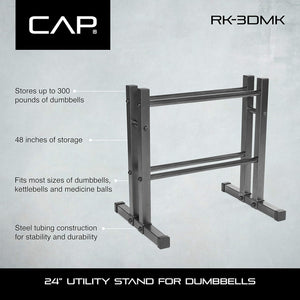 Keep all of your equipment organized and in one place with the CAP Utility Storage Rack for Dumbbells, Medicine Balls and Kettlebells. You can store Dumbbells, Kettlebells and Medicine Balls effectively with this workout accessory. The CAP Utility Storage Rack is designed to take up as little space as possible, opening up your workout area to hold other items or give you enough space for your personal training. The stand features two levels where you can fit most sizes and brands of free weights or other exercise equipment. With a durable metal construction, this steel rack can hold up to 300 lbs. It has a compact design that keeps your equipment off the floor and safely away from workout or walking areas. Add this item to your personal gym and have the items you need on hand for a superb workout. Stay toned, fit and ready to go without leaving home.