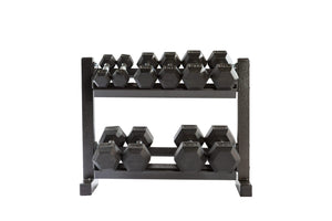 The YORK® 2-Tier Dumbbell Stand holds a full 5-25lb Rubber Hex Set, and will help you maintain your workout area organized and efficient. With the durable black finish and compact footprint is perfect for any space.