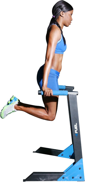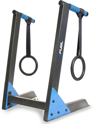 The Fuel Pureformance Dip Station allows you to get an excellent strength training workout in the smallest of spaces. Use as a dip station or with rings for a comprehensive upper body workout in minutes. Helps increase your range of motion and develop strength in your chest, shoulders, delts and triceps. Ideal for swing throughs, suspended exercises, knee raises and dips. Includes one Pro Dip Station, pair of Olympic rings and an exercise chart. Designed with angled grips for targeting chest and triceps and open pass through design for multiple exercises. Made of sturdy steel construction, padded grips and powder coat finish. 36"H x 25"W x 25"D.