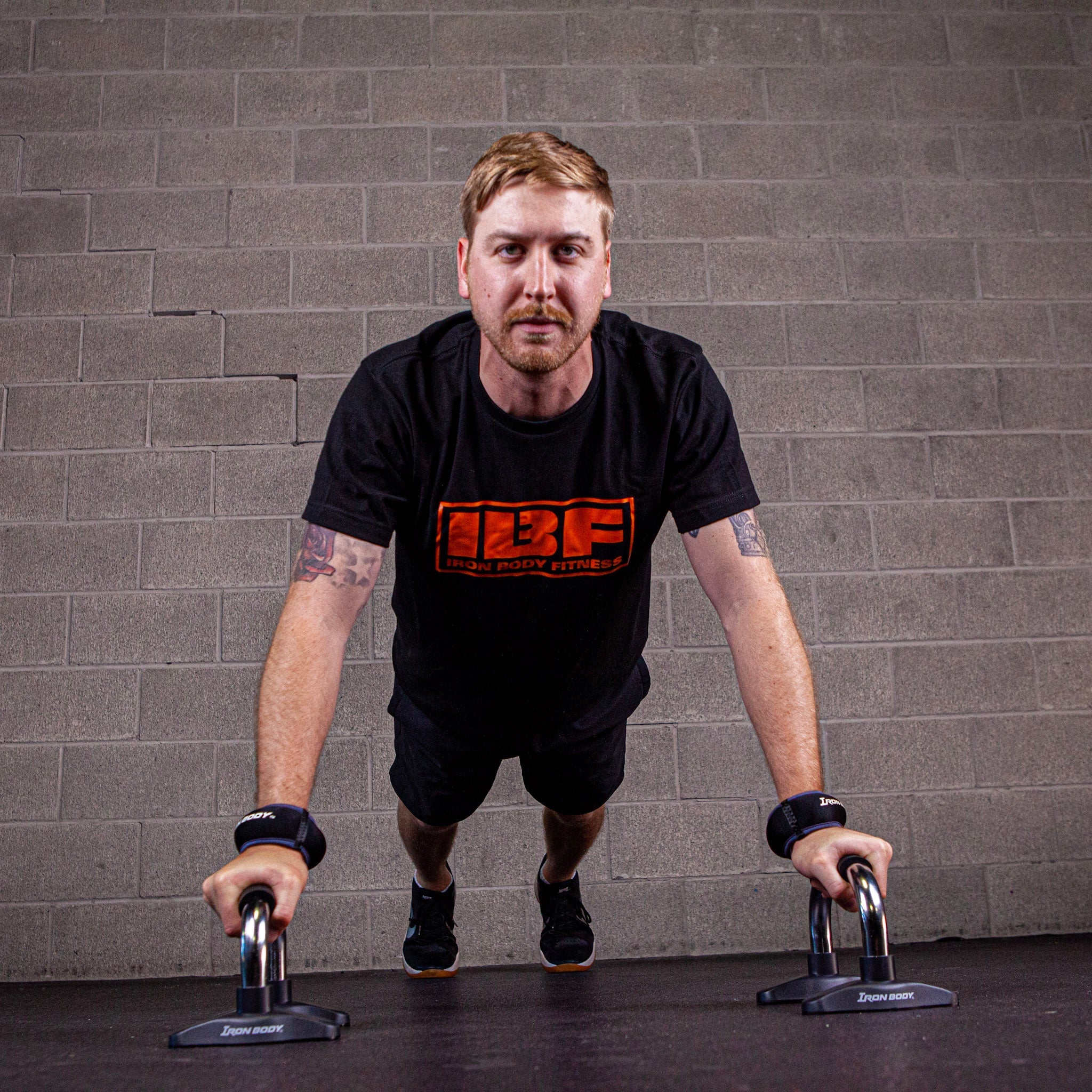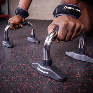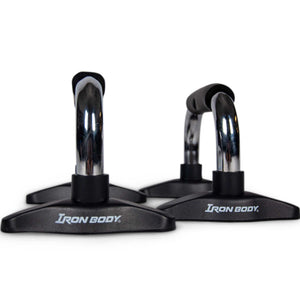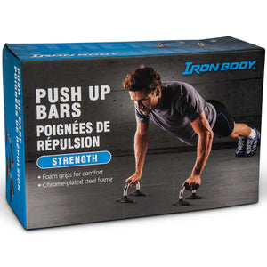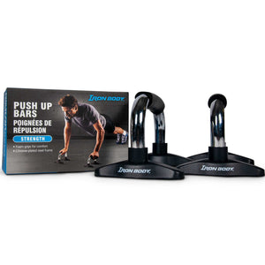 • IBF Iron Body Fitness chrome-plated push-up bars are ideal for building upper body and core strength.  Utilize different grips for pushups on the sturdy, non-slip foam-covered handles to target different muscles. Tone and strengthen your abdominal core, chest, shoulders, back and arm muscles with various exercises. Ideal for home gym workouts, travelling, or in the office.