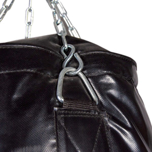 Whether you’re a professional training to compete or trying boxing or muay Thai for the first time, a tough IBF Iron Body Fitness heavy punching bag is a must. The heavy-duty 22 oz. PVC-coated vinyl shell is hydraulically filled for even weight distribution with clump-free specially blended fibre. The heavy-gauge welded “D” ring allows you to tie down the bag from the bottom to prevent swaying while striking. A powder-coated steel chain and swivel assembly will keep your bag hanging tough. Available in 75 lbs., 100 lbs. and style 125 lbs.