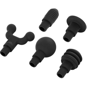 A bullet attachment to pinpoint problem areas and release trigger points. A fork attachment with rounded ends to work around specific muscle groups. A ball attachment for greater surface areas. A flat attachment for smaller and more dense muscle groups. A cushion head for sensitive areas.