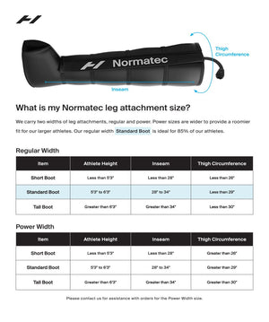 The Normatec Power Boot Attachment is our wider sleeve alternative designed for individuals with greater than 30″ thigh circumference. The Normatec Power Boot Attachments feature five overlapping zones for gapless compression. Composed of premium materials, this leg sleeve is compatible with the Normatec 3, Pulse and Pulse Pro 2.0 air compression devices (sold separately). Three size options; standard for 5’4” to 6’3” individuals, tall for 6’4” and over, and short for 5’3” and under individual. No need for the extra leg width? Check out our original Boot Attachment.