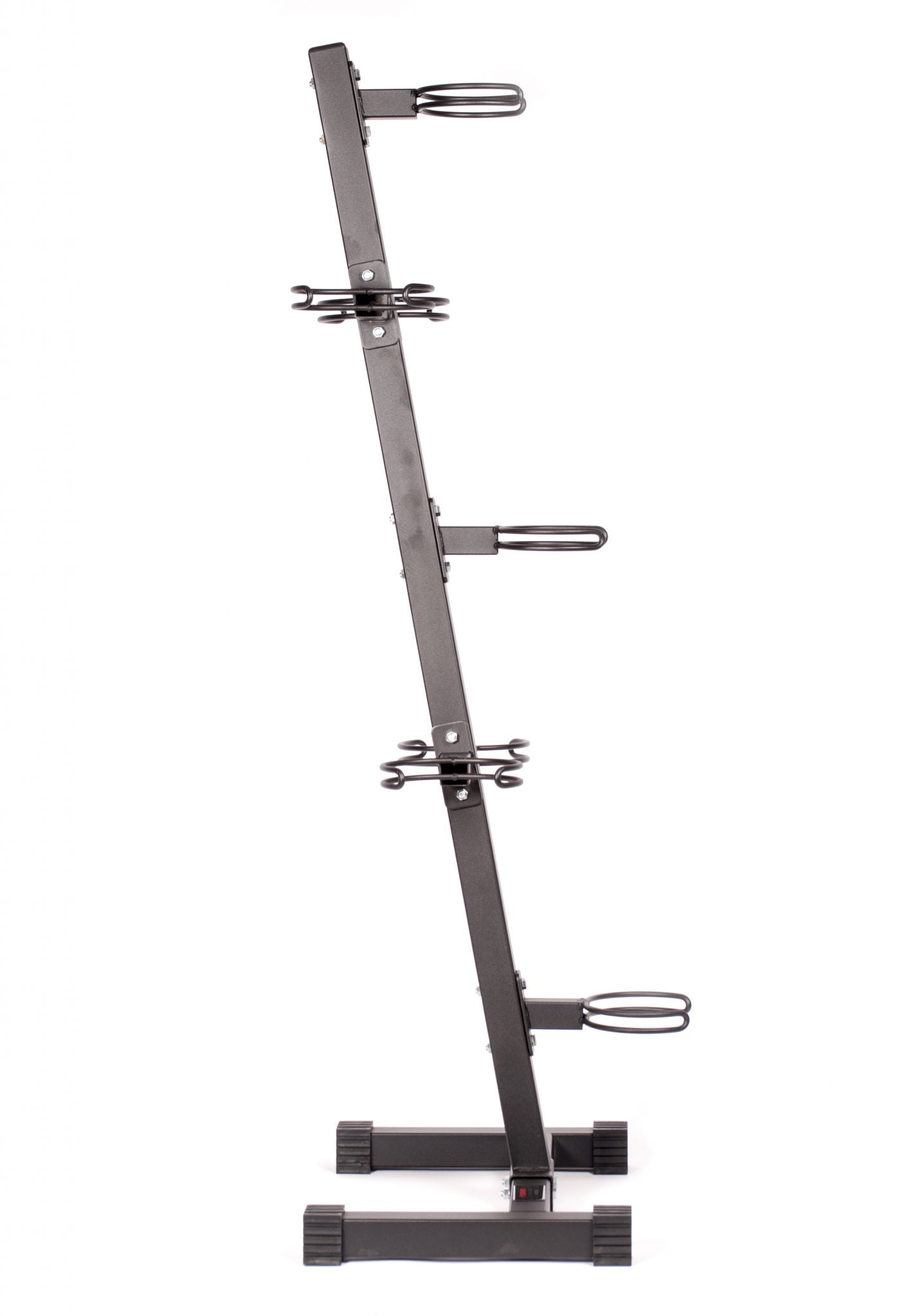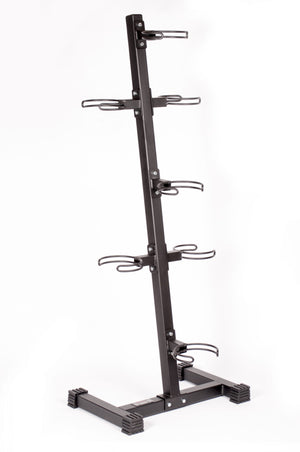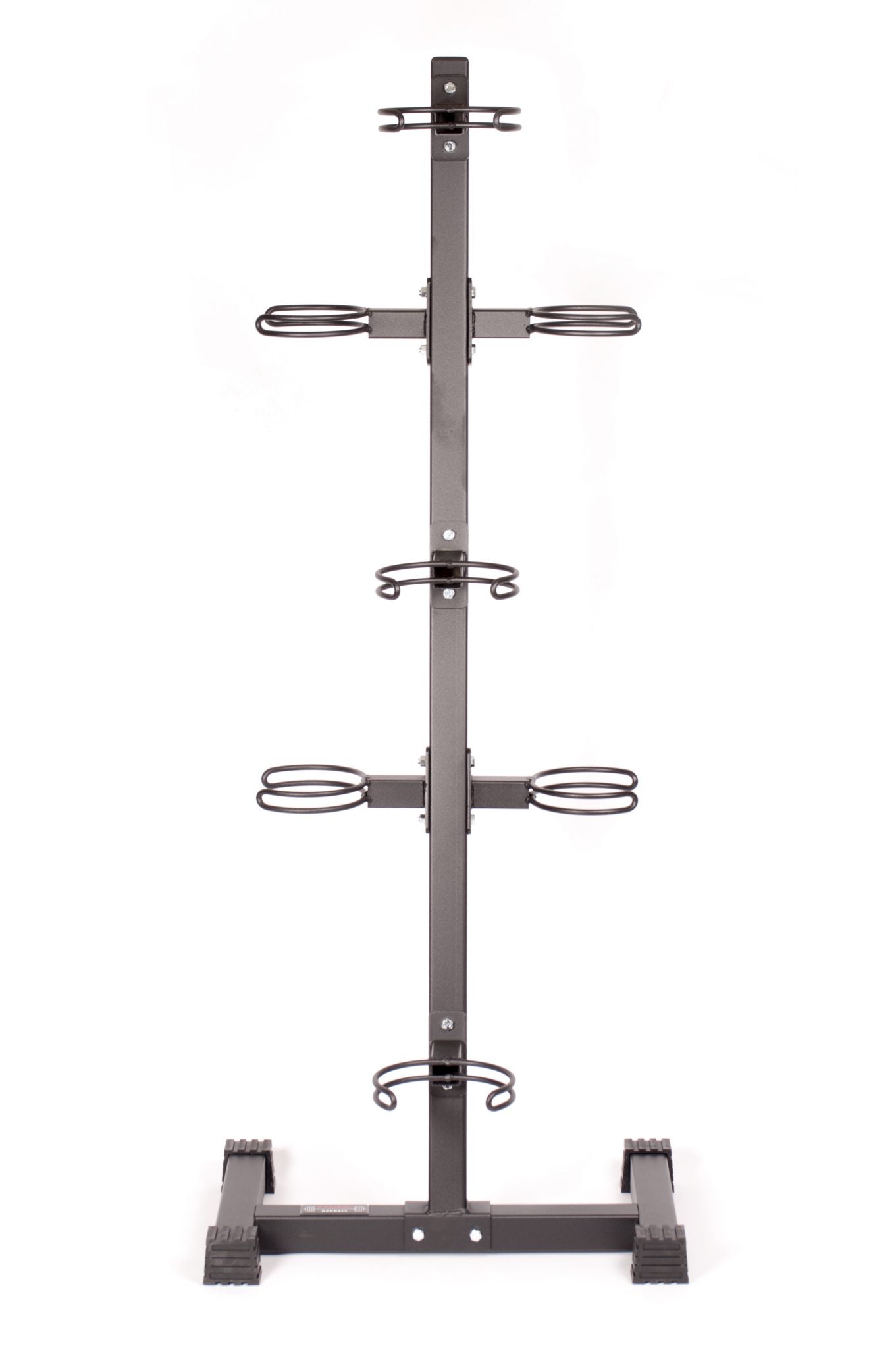 This vertical rack stores seven York medicine balls of any size in an easy to access format with three in the front and two on each side. The angled frame provides for equal weight distribution and plastic foot caps protect flooring.