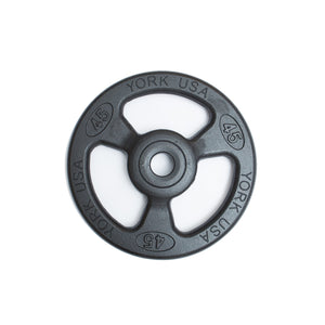 The YORK® ISO-Grip Plate is the industry’s answer to a 360-degree easy-pick-up plate cleverly achieved by casting the hub thicker than the rim. The patent-pending, radical benefit of a thicker hub and a streamlined rim is the anti-pinch nature of using the plates. The streamlined rim ensures a comfortable grip and enhanced maneuverability with its 3-grip design. The steel composite casting coating makes these plates highly durable. Perfect for school weight rooms, in-home gyms, and commercial settings.