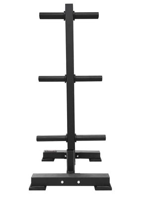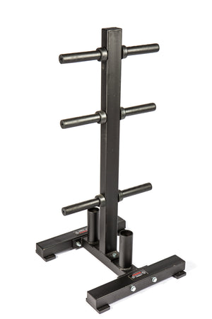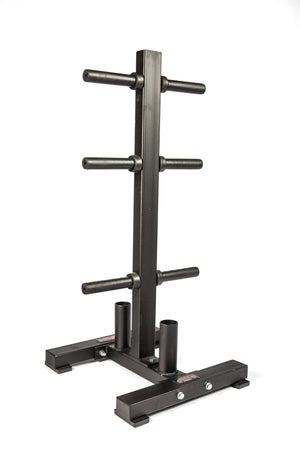 This YORK® Olympic Weight Plate Tree keeps 2” Olympic weights up off the floor, preventing tripping hazards and allowing for easy plate changes. It features six plate storage pegs that can accommodate 2.5 lb. through 45 lb. Olympic plates. This rack also features two Olympic barbell holders for storage. The design of this plate tree helps to distribute the weight evenly as well as keep the rack from tipping over when loaded. The attractive black finish compliments most workout spaces.