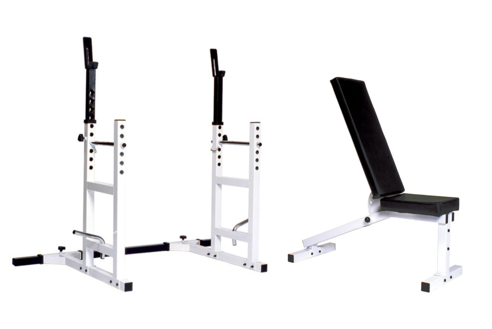 This combo set includes one #4224 incline-to-decline bench and one #4232 squat rack. Both units are crafted from 13 gauge steel for stability.