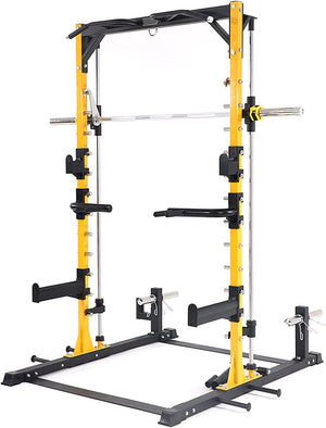 Due to the stability of the Smith Machine, it is a convenient and safe fixture for heavy weight training. There are rubber belt hooks on the upper and lower ends of the Smith machine. You can use the elastic rope to personalize your training and adjust the weight for different needs. This fixture includes functions of the Smith machine, half-rack, high tensile training machine, GTX bodyweight, pull-up and other multi-functional equipment. It has a stable square body structure, sandbags with small hooks, smooth bearings, and multi-functional weightlifting rods