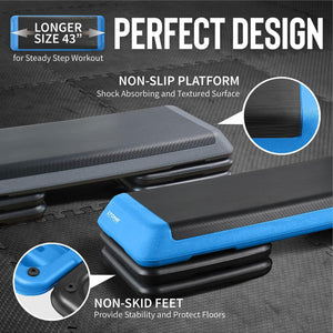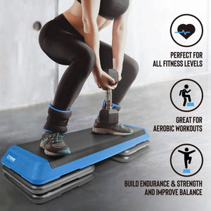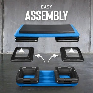 The CAP Adjustable Aerobic Step Platform in Gray & Blue is a great addition to your cardio workout. The FOUR included black risers allow you to intensify your workout by adjusting the height of your aerobic step. Combine other fitness accessories (not included) to burn additional fat and calories during your cardio session. The non-slip step surface provides a safe, secure surface during your workouts. Great for high or low intensity cardio workouts. For indoor or outdoor use on a flat, dry surface.
