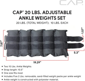 These CAP Adjustable Ankle Weights can effectively tone and shape your muscles with regular use. The added resistance offered by this set ranges from 5 to 10 lb, the ankle weights will build stamina and give your legs an overall toned look. The weights are adjustable via external pockets and can be worn anywhere, including at home, the office or just running errands. Walking with these weights can add that extra boost to your workout. Add or remove weight without taking the ankle weights off and adjustable hook & loop closures ensure a secure fit. These ankle weights have external pockets, so you can adjust the weight to suit your needs. The ankle and wrist weights offer a way to add to your workout with little effort