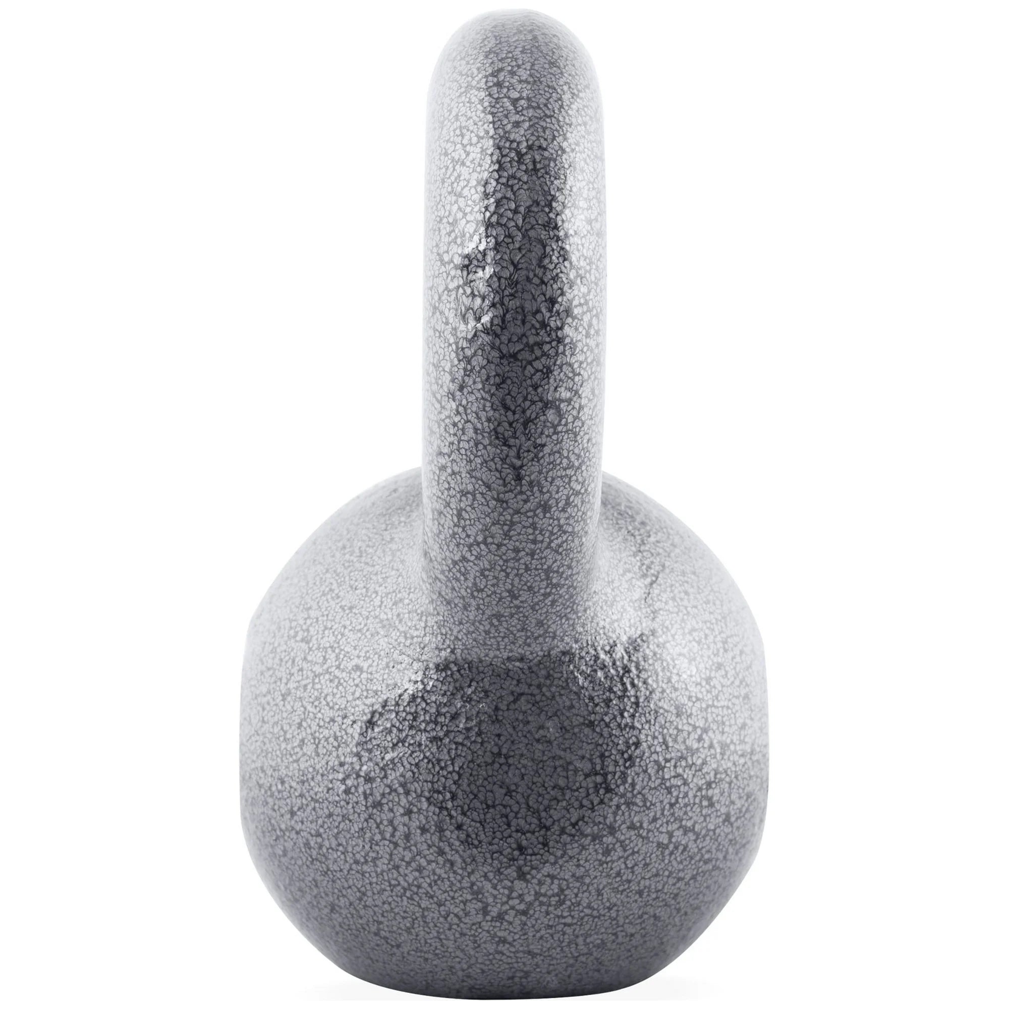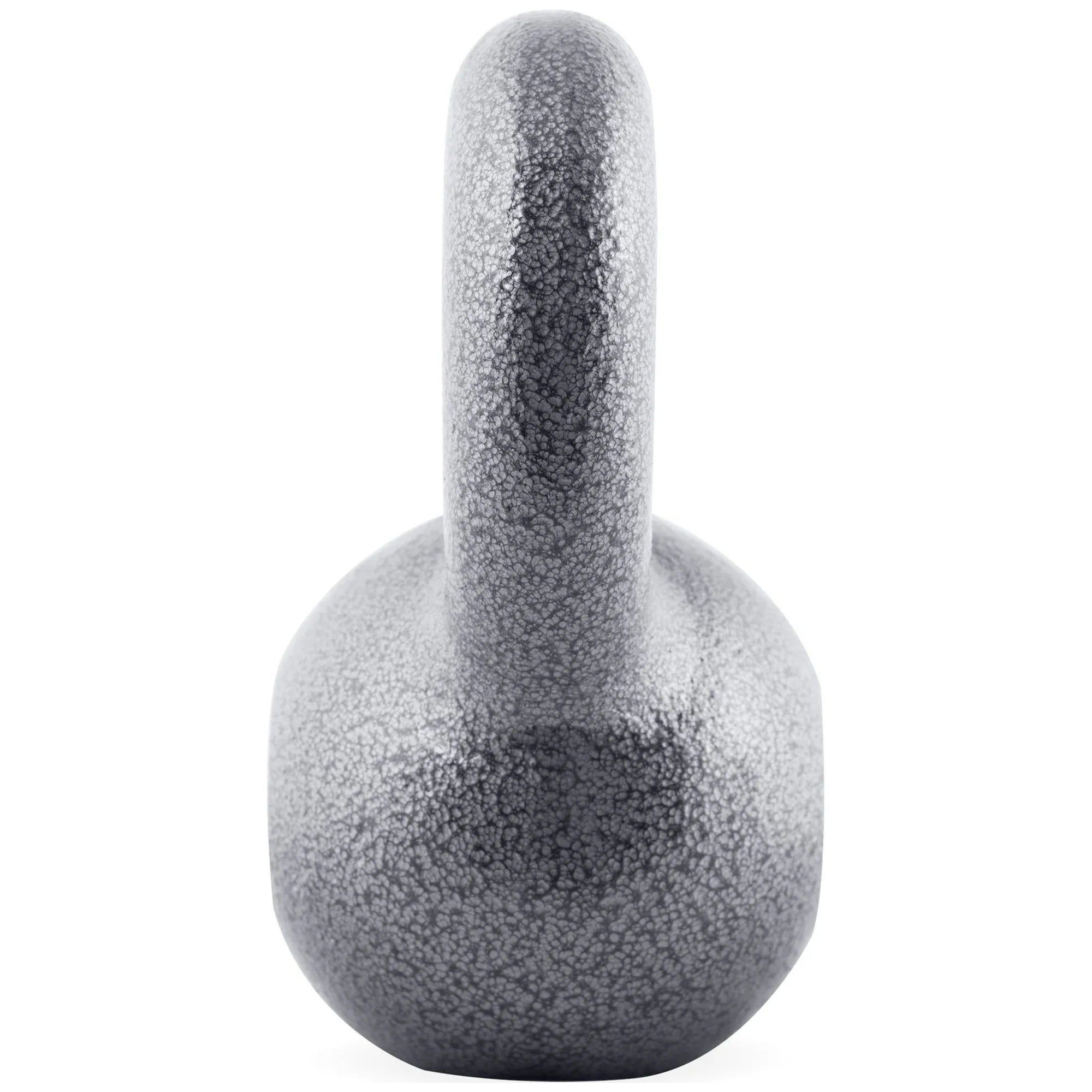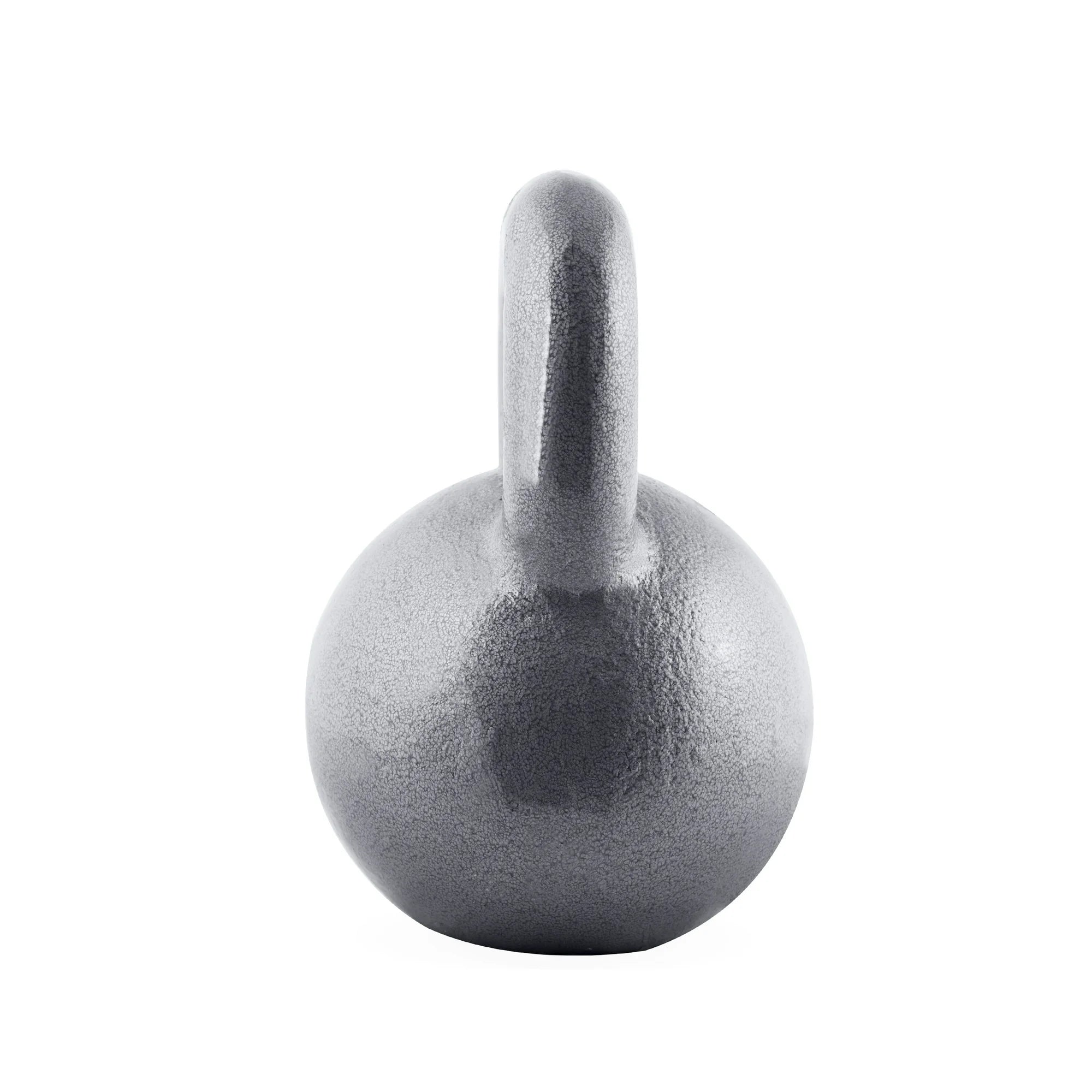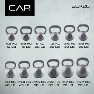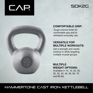 • You can improve your strength and endurance with ease using the CAP Cast Iron Kettlebell. It is designed to strengthen and tone your muscles by lifting and controlling its motion through a variety of prescribed exercises movements. Made from solid cast iron with a tough enamel finish, it is an extremely versatile piece of workout gear that will withstand everyday use. It features a soft, comfortable grip that allows you to switch it from one hand to the other while maintaining your balance and stability. When used with a controlled motion, this CAP Barbell kettlebell will help you get a whole body workout while focusing on specific muscle groups. You can perform bicep curls, triceps extensions and other exercises quickly and efficiently. Give your body a full workout in just a matter a minutes with this kettlebell.