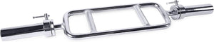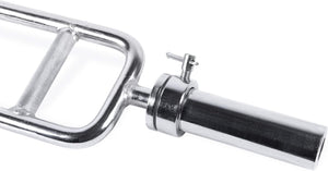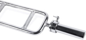 The CAP Barbell Olympic Triceps Bar is constructed of cold rolled solid steel with a chrome finish for durable, long-lasting performance. This bar features medium depth knurling for a non-slip grip when going heavy with revolving sleeves to reduce pressure on the wrists and forearms. The neutral grips offer a better overall grip, providing a better way to control your movements when exercising. Target the triceps, biceps and shoulders when using this bar. The collars are included to secure the weights; the bar accommodates weight plates with a 2-inch center hole (Olympic plates). The dimensions for this bar are as follows: 34.25” L x 6.69” W x 2.76” H. This bar weighs 19.28 pounds and has a weight capacity of 200 lbs.