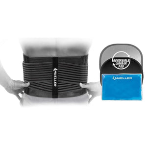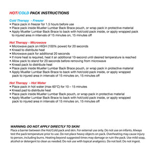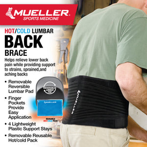 The Mueller® Hot/Cold Lumbar Back Brace helps relieve lower back pain whileproviding support to strains, sprained and aching backs. It comes with a dual-sided, removable lumbar pad for varying levels of support, as well as a removable hot/cold pack to help reduce pain and swelling. This versatile back brace has secondary straps for custom fit and compression.Helps with postural correction as well.