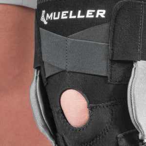 Mueller® Green Adjustable Hinged Knee Brace offers maximum support for weak knees, injured knees, and arthritic knees. Ideal for active individuals during sports and other physical activities. This self-adjusting brace provides maximum medial-lateral support. Metal hinges help protect the knee from hyperextension. Criss-cross straps help provide self-adjusting support and focused compression. Two side hinge pockets to ensure proper positioning for your knee size. One size. Fits either knee.